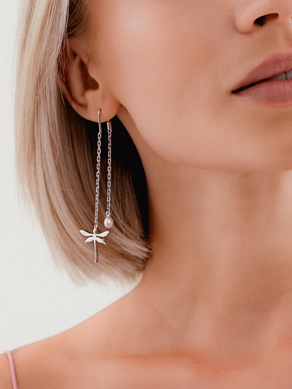 Double-sided Dragonfly Earrings feature natural pearls and a specially designed secure closure for maximum comfort and safety - so you never have to worry about losing them. Their unique, minimalist design gracefully accentuates the neckline, adding a refined, effortless elegance to any look.